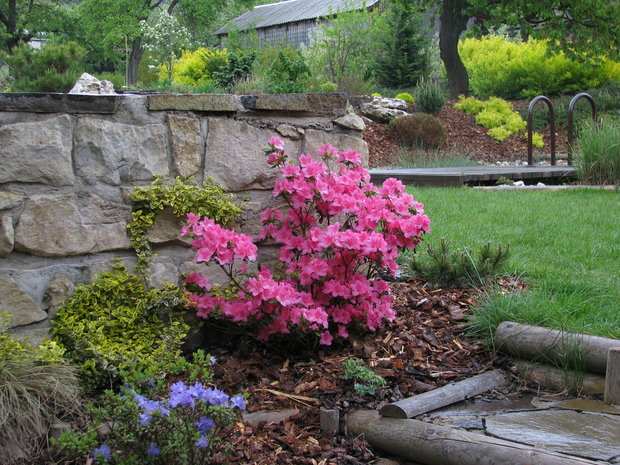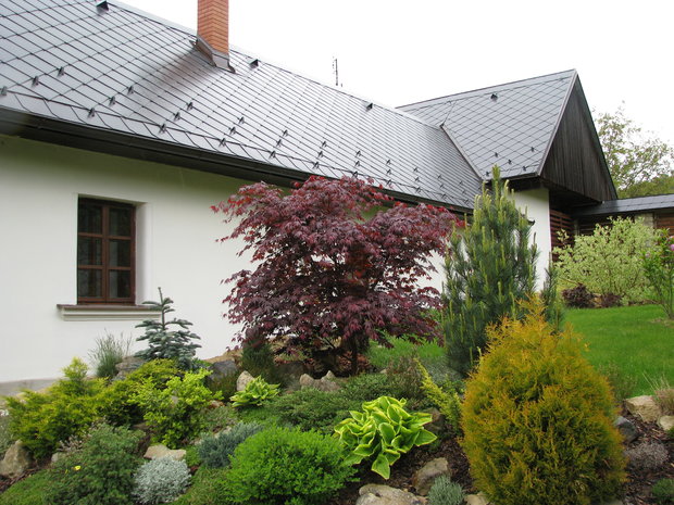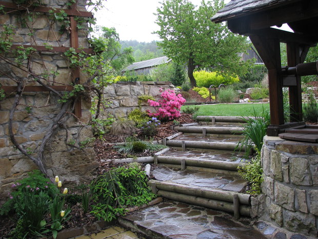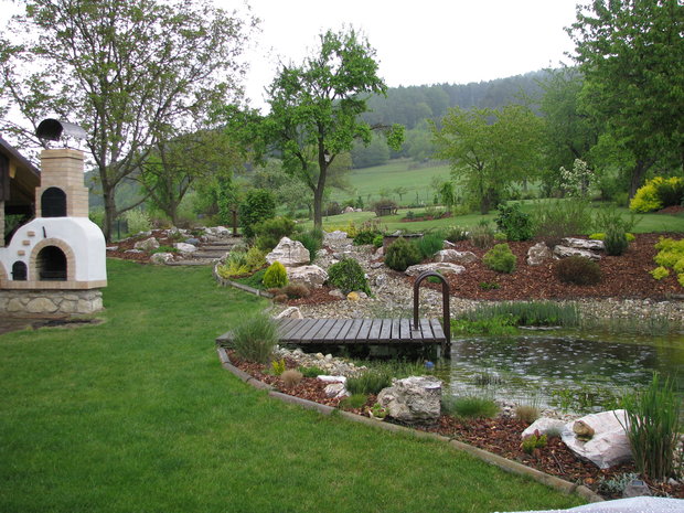Základem práce byly terénní úpravy hlavní pobytové části zahrady – prostoru, jehož centrem se mělo stát koupací jezero. Zde bylo také plánováno v návaznosti na dům posezení s možností grilování. Byl vybagrován výkop pro jezero a upraven terén pro potůček vtékající do jezera. Odclonění od hospodářského zázemí souseda měl zajistit terénní val, do kterého byly usazeny kameny. Svažitý terén byl upraven tak, aby vznikly rovinaté partie, jež je možno pobytově užívat. I v dalších částech zahrady jsme si pohráli s terénem a vytvořili kopečky, které podpoří vnímání prostoru a oživí jej. Samotné výsadby byly řešeny s ohledem na míru využívání daného místa. Kolem jezera a potůčku jsou nejpestřejší s důrazem na detail, směrem dozadu tvoří pozvolný nenásilný přechod do krajiny. Citlivé použití přírodních materiálů dotváří venkovskou atmosféru. Vždyť pro ohraničení záhonů je možno použít (namísto plastového obrubníku ze supermarketu) dřevěnou kulatinu, která tvoří i bočnice schodů do zahrady. A jaký je výsledný efekt pro uživatele zahrady? Největším zážitkem je pohled přes jezero nahoru do kopců při poslechu zurčící vody a zpěvu ptáků.