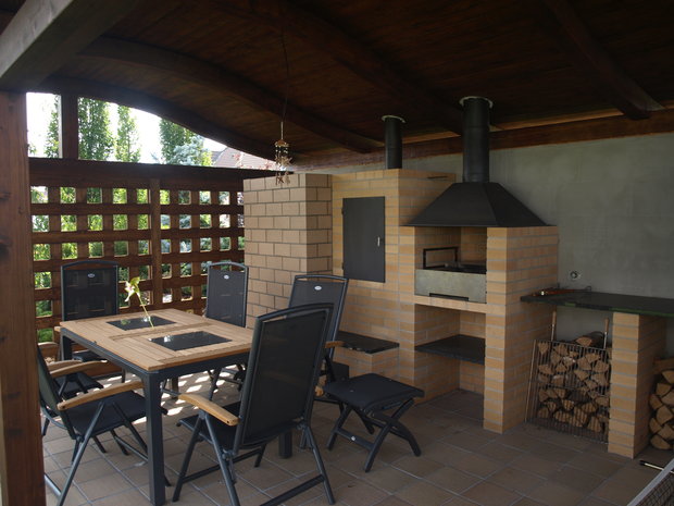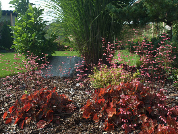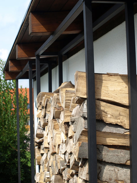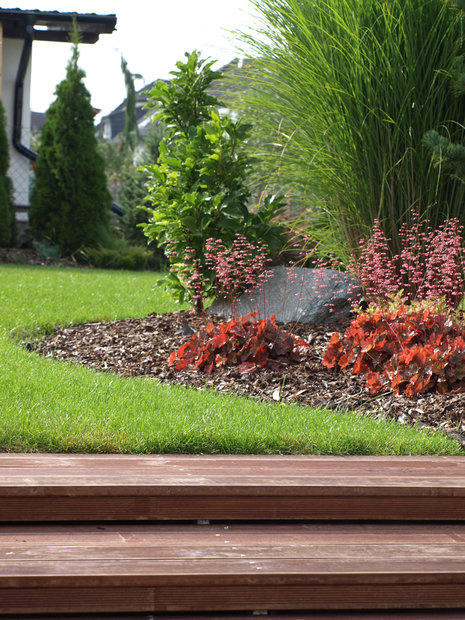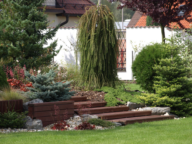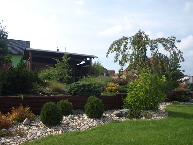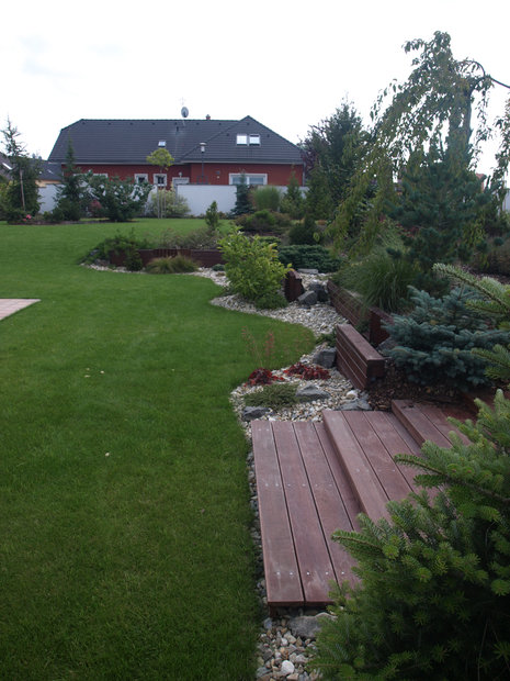 Při návrhu této zahrady jsme vycházeli z požadavku majitelů, vytvořit prostor estetický, ale zároveň maximálně využitelný pro pobyt, zvláště pro hru dětí i drobné sportovní aktivity. Pozemek u rodinného domu je svažitý, přivrácený ke stavbě. Vytvořili jsme tedy dvě rozdílné výškové úrovně. Nižší, navazující na terasu a dům a vyšší, přístupnou schodištěm či travnatým svahem. Pro zdůraznění terénních rozdílů byly vybudovány zídky, na jejichž konstrukci byly použity kov a dřevo. Horizontálně uložené hranoly vnáší do zahrady zklidnění a kontrastují s hmotou lomového kamene. Výsadbou již vzrostlých stromů jsme dosáhli intenzívnějšího působení vegetace ve smyslu vímání hloubky prostoru, střídání osluněných a zastíněných částí zahrady, ale i větší intimity soukromé zahrady.