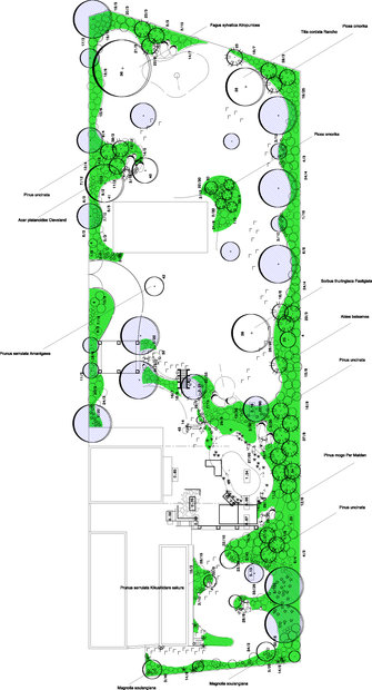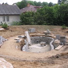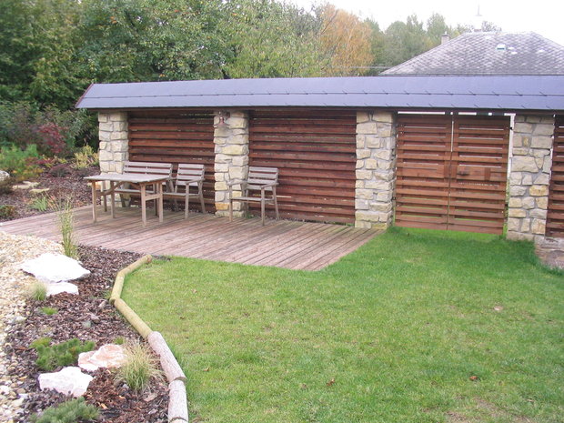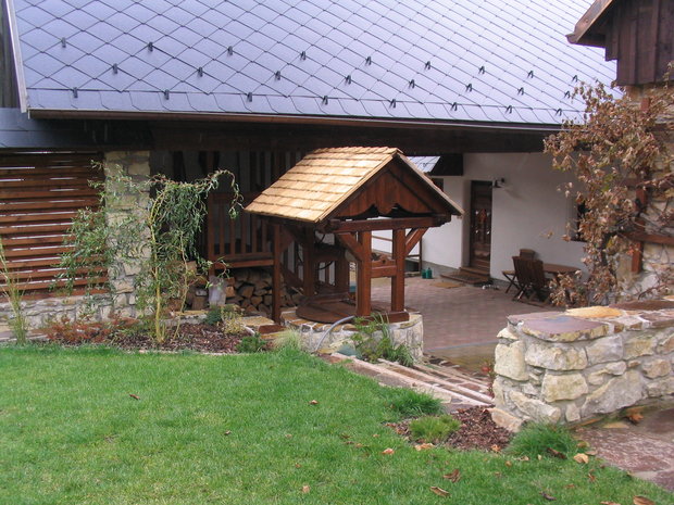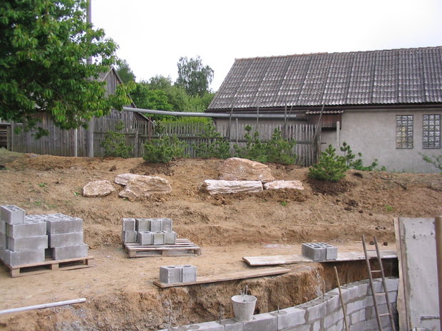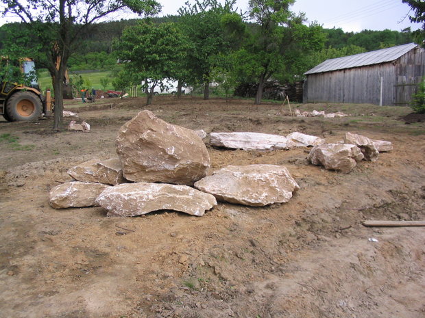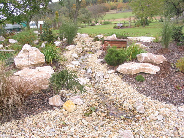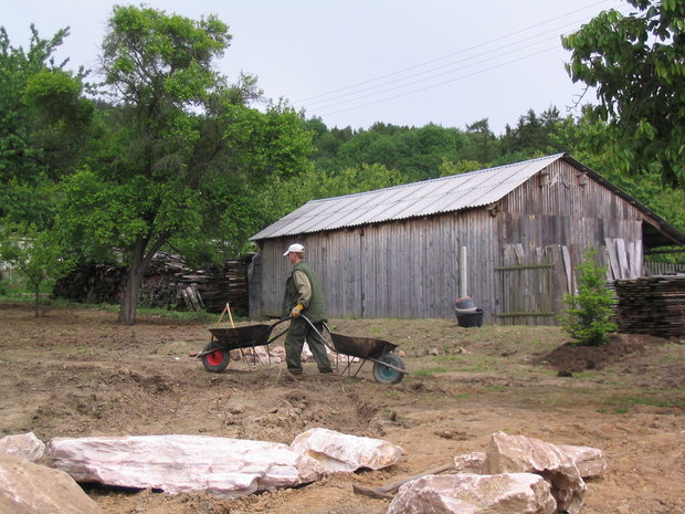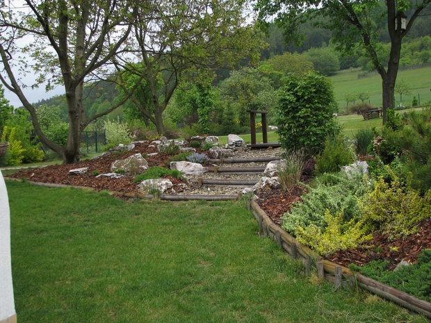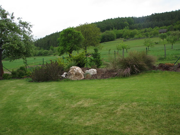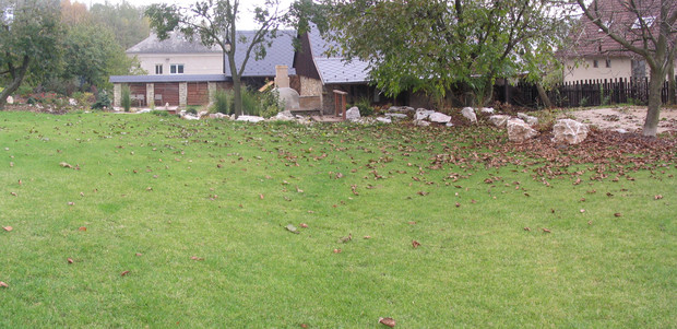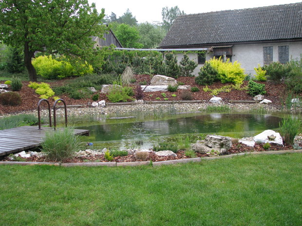 Základem práce byly terénní úpravy hlavní pobytové části zahrady – prostoru, jehož centrem se mělo stát koupací jezero. Zde bylo také plánováno v návaznosti na dům posezení s možností grilování. Byl vybagrován výkop pro jezero a upraven terén pro potůček vtékající do jezera. Odclonění od hospodářského zázemí souseda měl zajistit terénní val, do kterého byly usazeny kameny. Svažitý terén byl upraven tak, aby vznikly rovinaté partie, jež je možno pobytově užívat. I v dalších částech zahrady jsme si pohráli s terénem a vytvořili kopečky, které podpoří vnímání prostoru a oživí jej. Samotné výsadby byly řešeny s ohledem na míru využívání daného místa. Kolem jezera a potůčku jsou nejpestřejší s důrazem na detail, směrem dozadu tvoří pozvolný nenásilný přechod do krajiny. Citlivé použití přírodních materiálů dotváří venkovskou atmosféru. Vždyť pro ohraničení záhonů je možno použít (namísto plastového obrubníku ze supermarketu) dřevěnou kulatinu, která tvoří i bočnice schodů do zahrady. A jaký je výsledný efekt pro uživatele zahrady? Největším zážitkem je pohled přes jezero nahoru do kopců při poslechu zurčící vody a zpěvu ptáků.