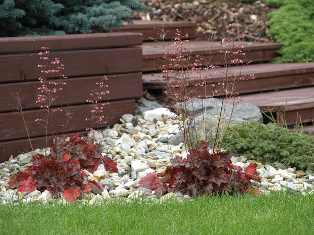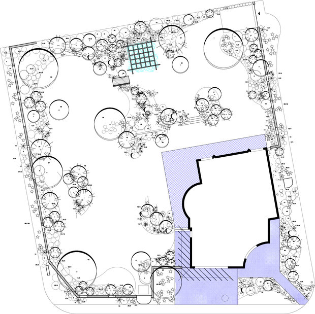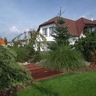 Při návrhu této zahrady jsme vycházeli z požadavku majitelů, vytvořit prostor estetický, ale zároveň maximálně využitelný pro pobyt, zvláště pro hru dětí i drobné sportovní aktivity. Pozemek u rodinného domu je svažitý, přivrácený ke stavbě. Vytvořili jsme tedy dvě rozdílné výškové úrovně. Nižší, navazující na terasu a dům a vyšší, přístupnou schodištěm či travnatým svahem. Pro zdůraznění terénních rozdílů byly vybudovány zídky, na jejichž konstrukci byly použity kov a dřevo. Horizontálně uložené hranoly vnáší do zahrady zklidnění a kontrastují s hmotou lomového kamene. Výsadbou již vzrostlých stromů jsme dosáhli intenzívnějšího působení vegetace ve smyslu vímání hloubky prostoru, střídání osluněných a zastíněných částí zahrady, ale i větší intimity soukromé zahrady.